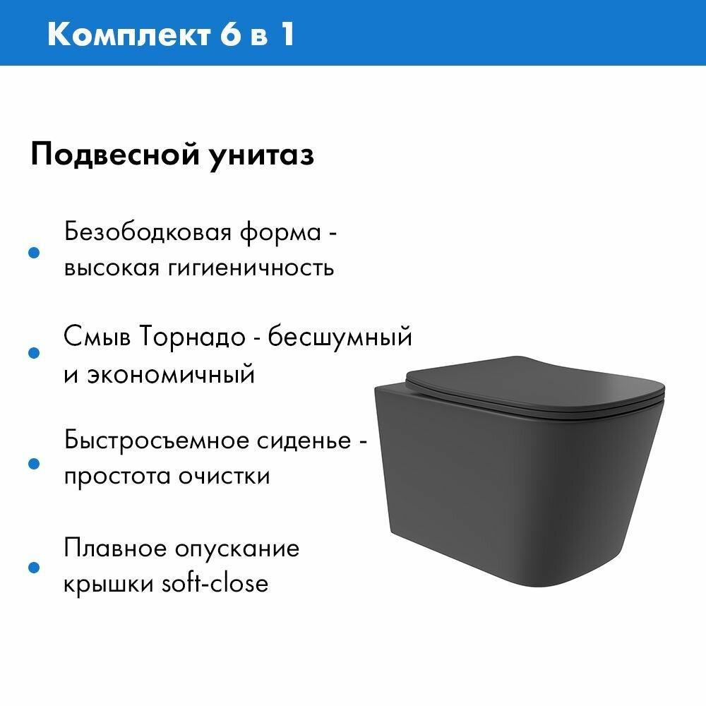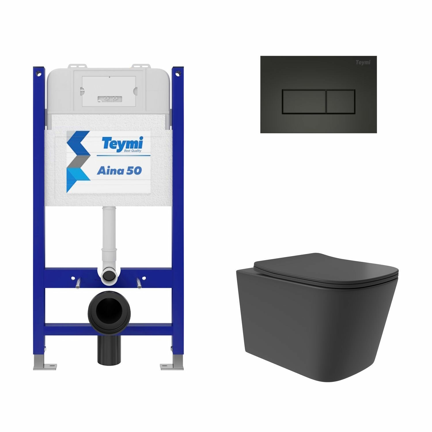 Купить Комплект Инсталляция Teymi Aina 52 T70033, клавиша Helmi, черный матовый T70203BM + Унитаз подвесной Long 525*345 безободковый, Vortex, сиденье Soft-Close, черный матовый, форма квадрат с доставкой по всей России.
