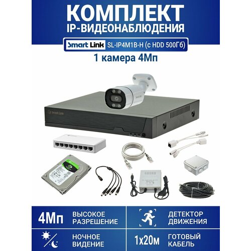 Комплект IP-видеонаблюдения 4Мп на 1 камеру Smart Link SL-IP4M1B-H — это готовый набор, включающий в себя 1 уличную камеру, 10-канальный IP-видеорегистратор, обеспечивающий запись камер на жёсткий диск (в комплекте диск на 500Gb), блоки питания, готовый кабель с разъёмами, длиной 20м на каждую камеру, и другие необходимые комплектующие.
