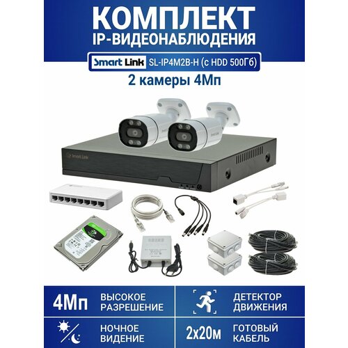 Комплект IP-видеонаблюдения 4Мп на 2 камеры Smart Link SL-IP4M2B-H — это готовый набор, включающий в себя 2 уличные камеры, 10-канальный IP-видеорегистратор, обеспечивающий запись камер на жёсткий диск (в комплекте диск на 500Gb), блоки питания, готовый кабель с разъёмами, длиной 20м на каждую камеру, и другие необходимые комплектующие.