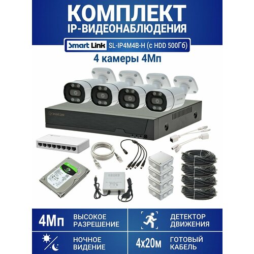 Комплект IP-видеонаблюдения 4Мп на 4 камеры Smart Link SL-IP4M4B-H — это готовый набор, включающий в себя 4 уличные камеры, 10-канальный IP-видеорегистратор, обеспечивающий запись камер на жёсткий диск (в комплекте диск на 500Gb), блоки питания, готовый кабель с разъёмами, длиной 20м на каждую камеру, и другие необходимые комплектующие.