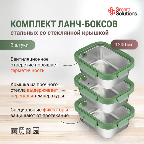 Комплект из 3-х стальных ланч-боксов со стеклянной крышкой, 1,2 л, зеленый: сравнение цен, характеристики, фото, актуальное наличие и цены.