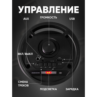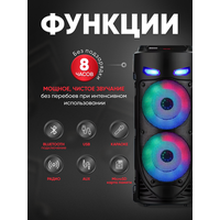 FM-радио, влагозащищенный корпус, караоке, поддержка microSD, ремешок, световые эффекты