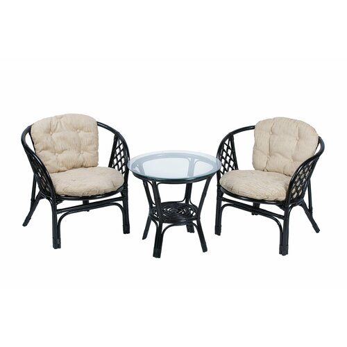 комплект состоит из двух кресел с подушками и круглого столика со стеклом