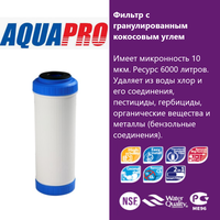 Удаляет из воды хлор и его соединения, гербициды, пестициды, органические вещества и бензольные соединения и газы. Улучшает вкус воды. Ресурс: 6000 л.