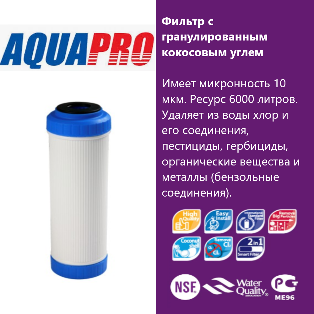Очищает воду от широкого спектра органических и неорганических растворенных примесей, свободного хлора, хлорорганических соединений, пестицидов, нефтепродуктов, тяжелых металлов, устраняет неприятный запах воды, улучшает ее вкусовые качества. Ресурс: 6000 л.