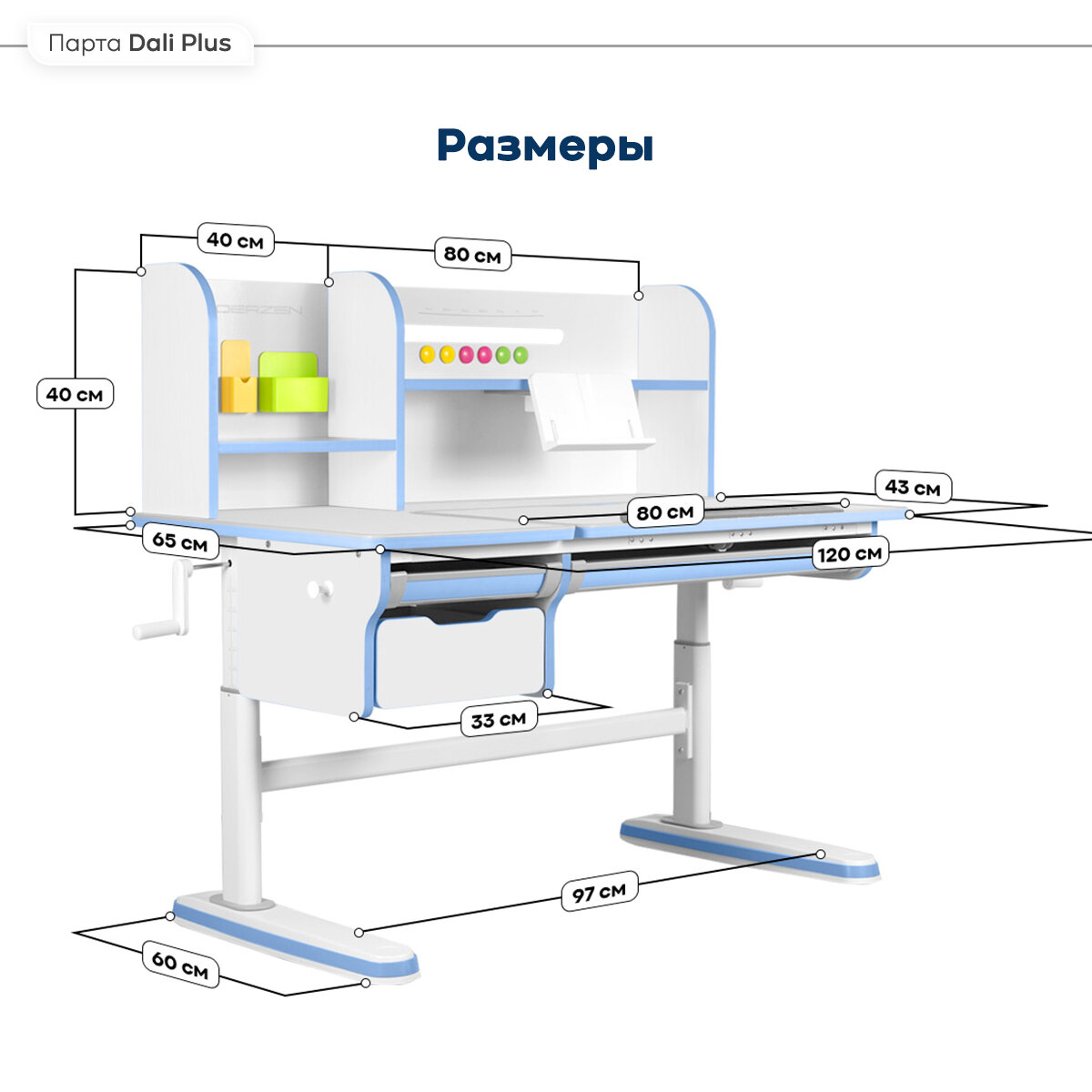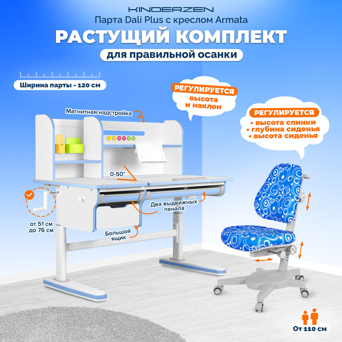 Растущий комплект KinderZen Dali Plus прекрасно подойдет для ребенка в возрасте от 4 лет и ростом от 110 см. Он будет расти вместе с ребенком и прослужит долгие годы. Комплект имеет множество ортопедических свойств и предназначен для формирования здоровой осанки, нормального кровообращения, четкого зрения и сохранения общего состояния здоровья ребенка. Благодаря регулировке парты по высоте, заниматься за ней можно не только сидя, но и стоя, а регулировка наклона позволяет подобрать правильный угол для каждого занятия и использовать столешницу в режиме мольберта. Комфортную посадку обеспечивает ортопедическое кресло, которое создаёт прочную опору для позвоночника и поддерживает его в правильном положении. Оно имеет регулировку по высоте и глубине, благодаря чему кресло можно подстроить под анатомические особенности ребенка. Анатомическая форма спинки и сиденья обеспечивает удобство и способствует здоровому кровообращению.