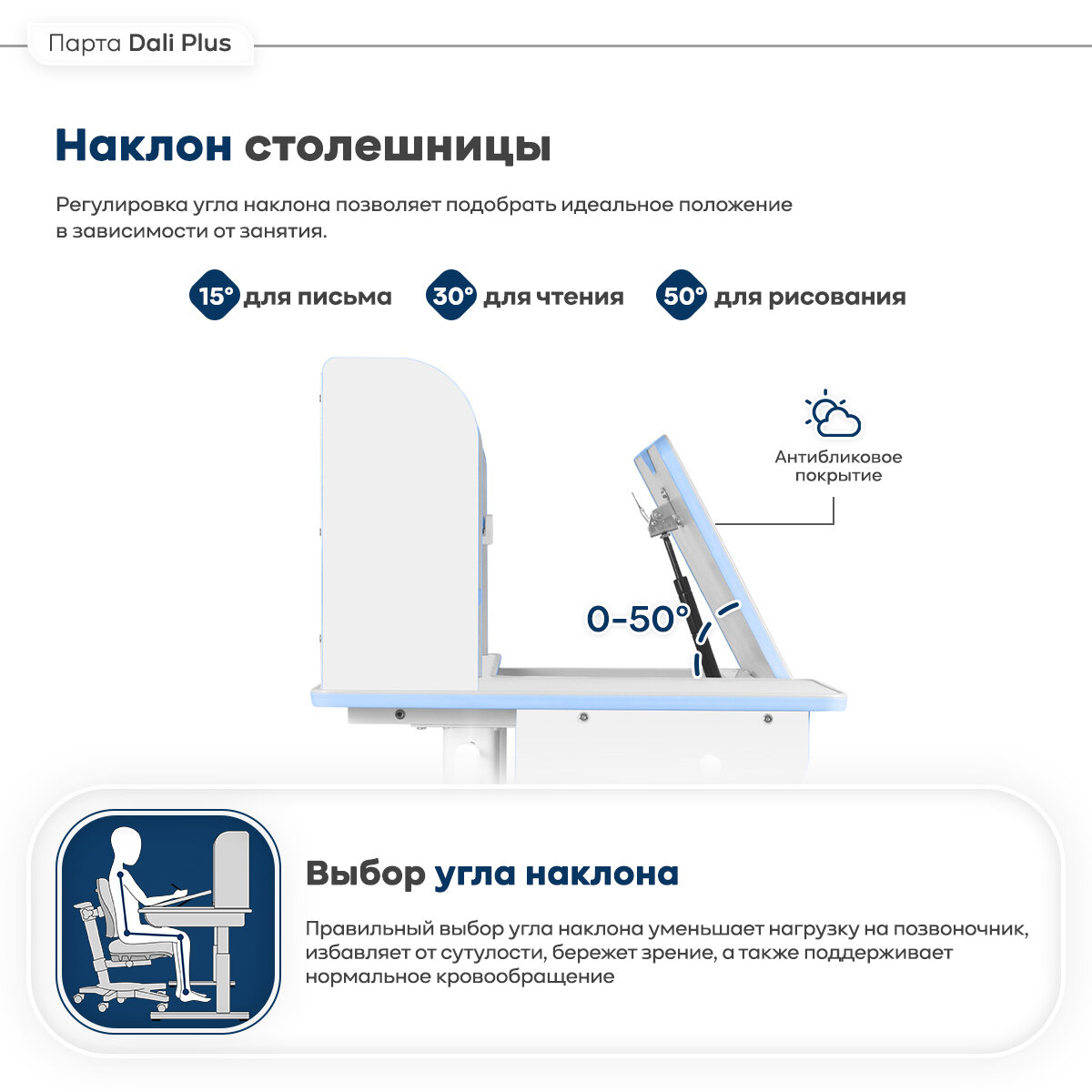 - Наклон столешницы регулируется от 0 до 50 градусов, позволяя подобрать нужный угол для письма, чтения и рисования.