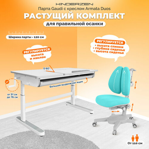 Комплект Kinderzen Gaudi - это отличный вариант для тех, кто планирует создать для своего ребенка эргономичное рабочее место, а также заботится о формировании красивой и правильной осанки ребенка. Рабочая зона поверхности парты Gaudi идеально подходит для детей ростом от 110 см. Парта уже имеет необходимую комплектацию, что дает все необходимое для удобного и эффективного процесса обучения. Стильное кресло высокого качества производства легко регулируется под размер стола и сохраняет здоровую осанку.