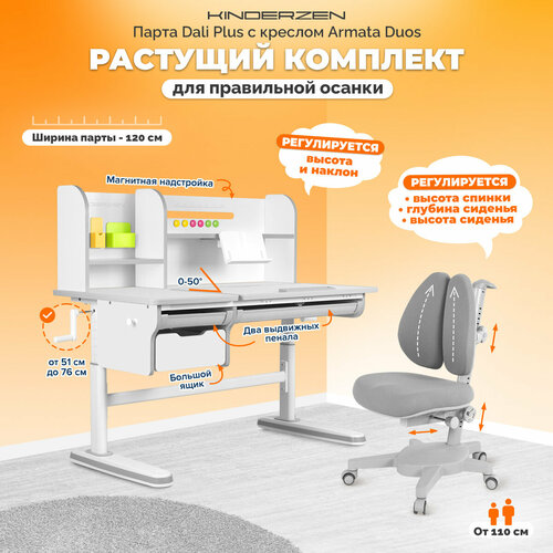 Купить Комплект Kinderzen парта + кресло, цвет белый/серый с серым креслом с доставкой по всей России.
