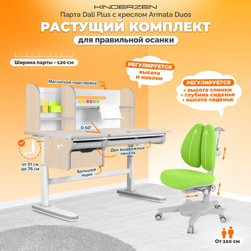 Купить Комплект Kinderzen парта + кресло, цвет клен/серый с зеленым креслом с доставкой по всей России.