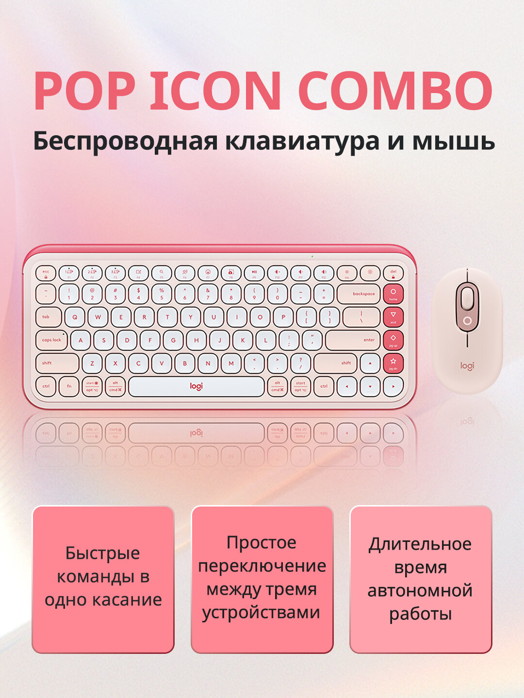 Купить Logitech Комплект мышь + клавиатура беспроводная POP Icon Combo, Английская раскладка, розовый с доставкой по всей России.