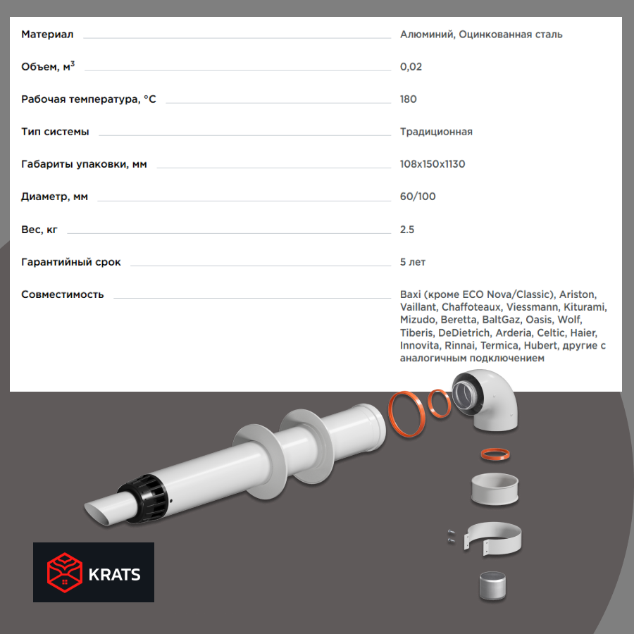 Комплект коаксиального дымохода Krats (Кратс) 60/100 (Vaillant, Viessmann, Kiturami, Ariston, Baxi) L 750 мм, с антилед: сравнение цен, характеристики, фото, актуальное наличие и цены.