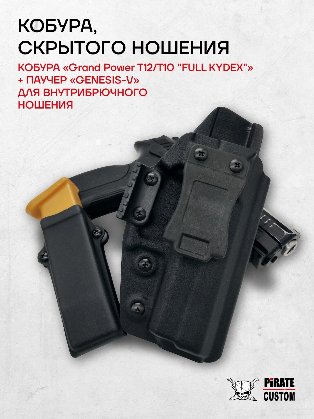 Полимерная оболочка защищает ваш пистолет и обеспечивает удобную переноску в течение всего дня. Кобура для пистолета Grand Power T10/T12 от PIRATE CUSTOM отличается компактностью, эргономикой, высокой комфортностью при ношении и не стесняет движение. Кобура на ремне удерживается за счет пластиковой клипсы.
