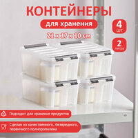Комплект контейнеров из 4х шт, пластиковые для хранения RoxBox с крышкой, 2л, 21х17х10 см, прозрачные