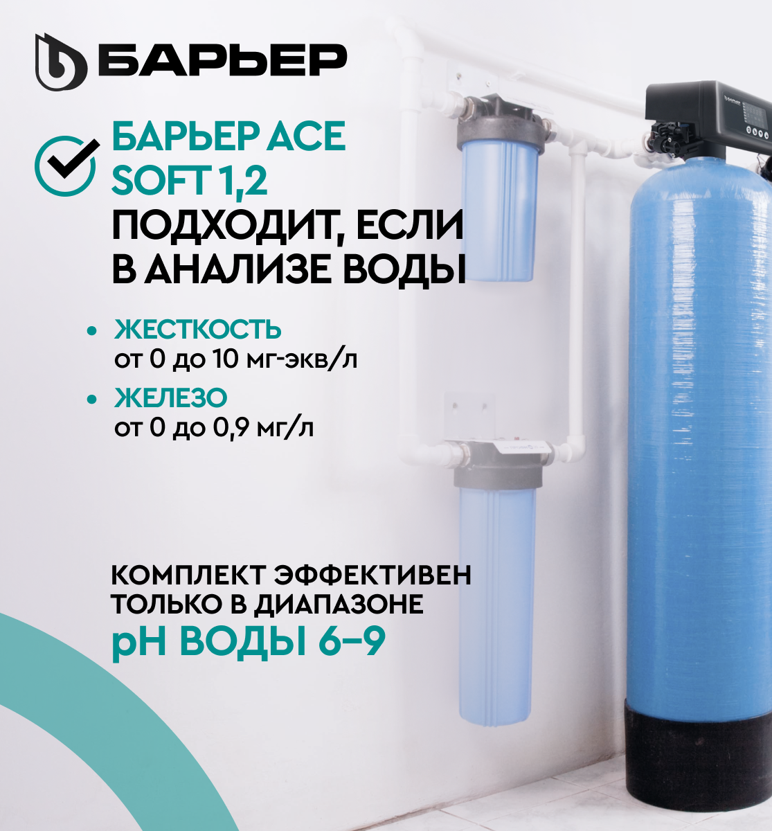 Комплект коттеджной системы Barrier Ace SOFT 1,2 предназначен для умягчения воды при следующих показателях: