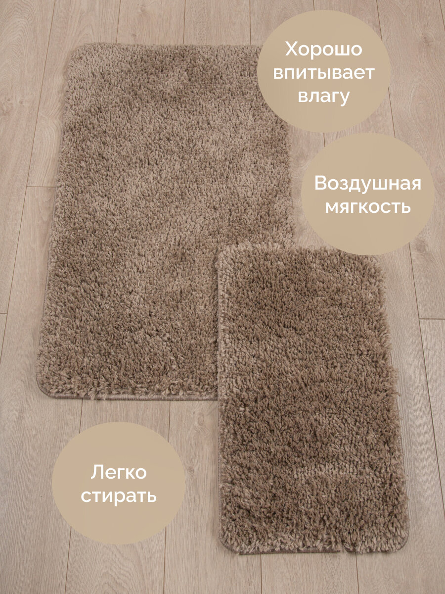 Оба коврика полностью экологичны, гипоаллергенны, антистатичны и нетребовательны к уходу. Мягчайший ворс дарит ногам ощущение мягкости и легкости, а нескользящая резиновая основа идеально удерживает коврики на любом полу.