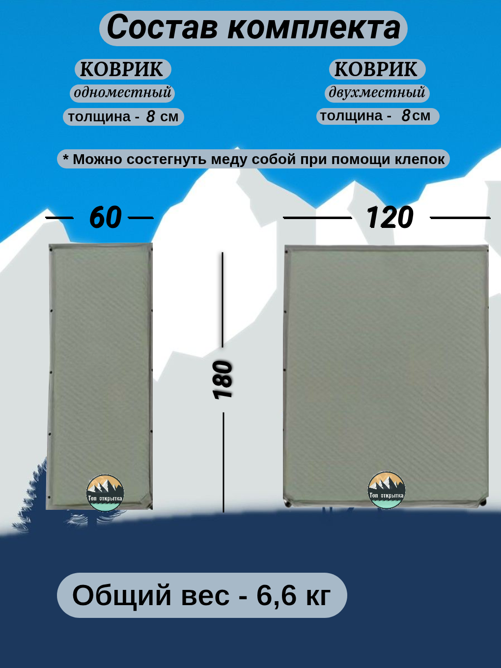 Комплект ковриков из 2шт (двухмест. + одномест.), толщина 8см, самонадувающиеся. Темно-зеленый. Общий размер 180х180см: сравнение цен, характеристики, фото, актуальное наличие и цены.