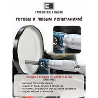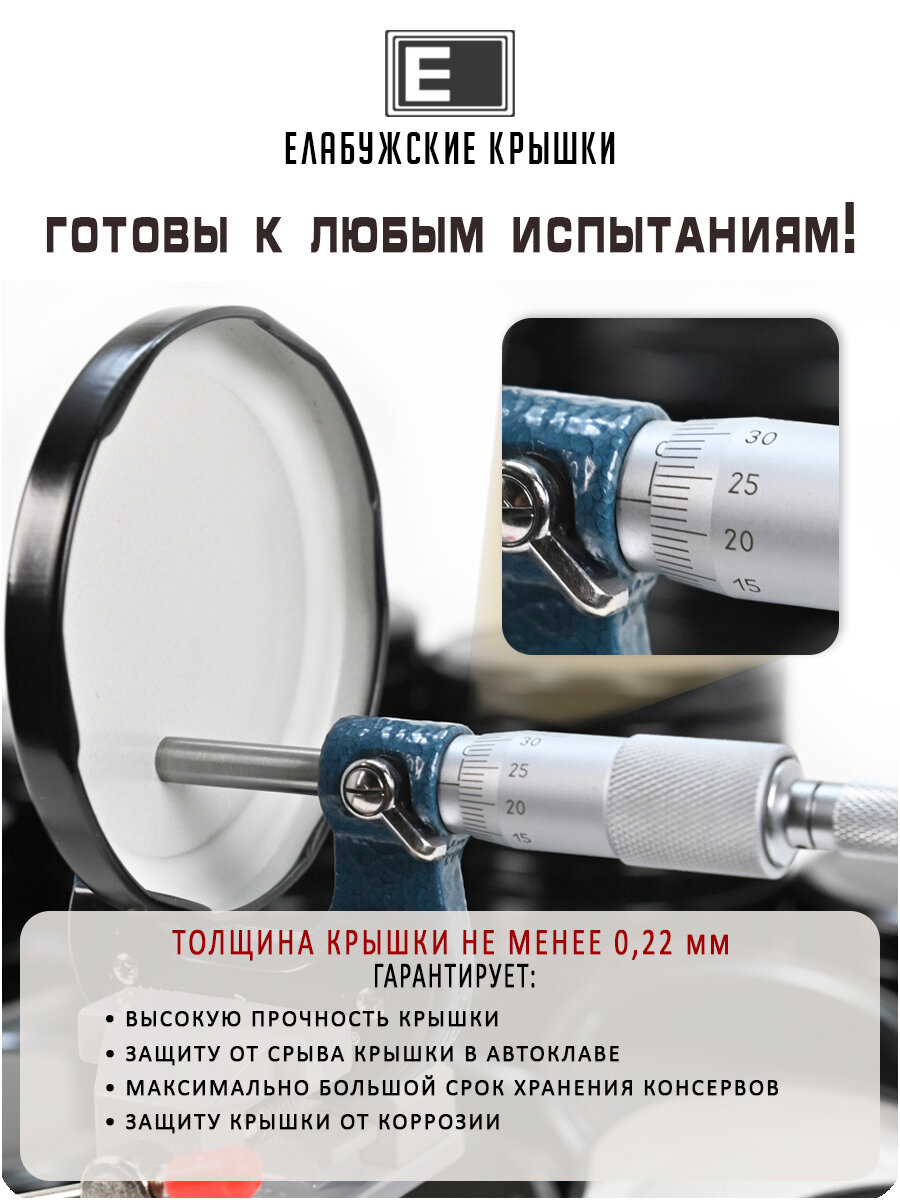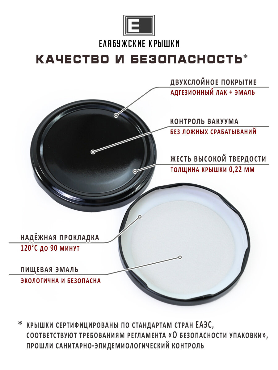 Крышки выпускаются под брендом «Елабужские крышки», изготовлены из пищевой жести толщиной 0,20 мм (Жесть марки ЭЖК 20, ГОСТ 13345-85), имеют эмалированное покрытие внешней стороны (черная эмаль).
