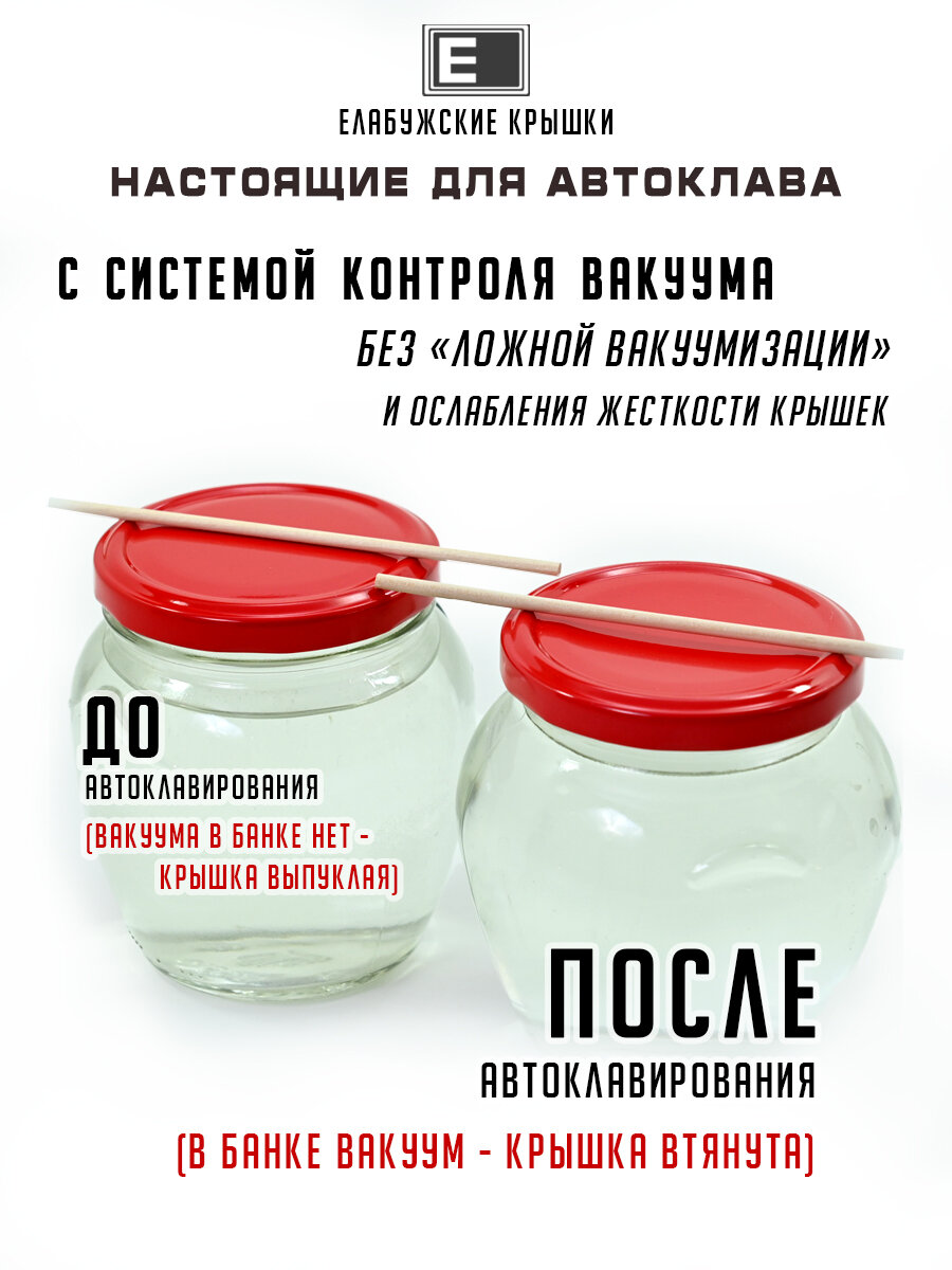 Крышки имеют уникальную систему контроля вакуумизации, которая исключает «ложную вакуумизацию». Геометрия крышек обеспечивает чёткий визуальный контроль вакуума в банках. До автоклавирования крышки выпуклы, после автоклавирования – втягиваются в банки. При этом на наших крышках нет классической «кнопки» с множеством рёбер, которая легко прожимается и уменьшает жесткость крышек. Роль «кнопки» в нашем случае выполняет почти вся поверхность крышки всего с одним ребром. Классическая «кнопка» легко продавливается пальцем и втягивается внутрь даже при малейшей разнице давлений. Например, если закрыть банку с горячей водой крышкой с классической «кнопкой», то, после остывании воды до комнатной температуры, кнопка втянется. Однако ни о какой стерильности содержимого банки в этом случае речи идти не может! Возникает так называемая «ложная вакуумизация». Если такое произойдёт после автоклавирования, то визуально будет казаться, что вакуум в банке есть, однако по факту содержимое банки начнёт бродить спустя несколько дней. Наши крышки втягиваются в банку только при большой разнице давлений и гарантировано показывают наличие вакуума в банке!