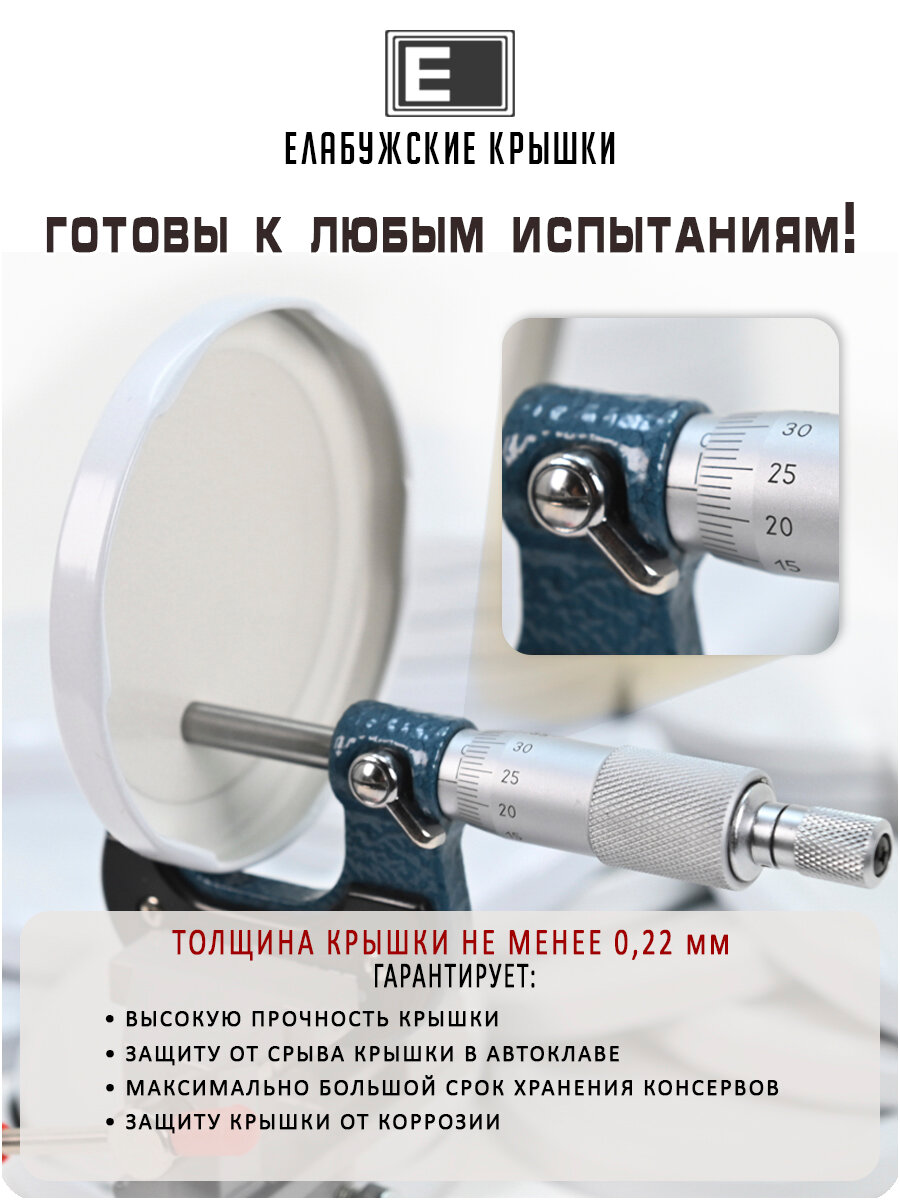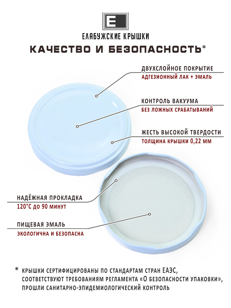 Крышки выпускаются под брендом «Елабужские крышки», изготовлены из пищевой жести толщиной 0,20 мм (Жесть марки ЭЖК 20, ГОСТ 13345-85), имеют эмалированное покрытие внешней стороны (белая эмаль).