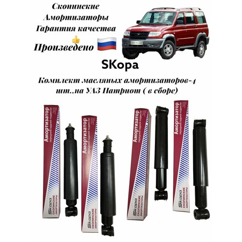 Комплект пердних, задних , масляных амортизаторов - 4 шт. , на автомобиль Уаз Патриот - UAZ PATRIOT . Амортизаторы Российского производителя SKOPA - Скопинские амортизаторы . Передние, задние амортизаторы, на правую и левую стороны. Масляные амортизаторы, полностью в сборе .- Амортизаторы передней, задней подвески УАЗ, для качественной и надежной езды, по бездорожью. Амортизаторы , от Скопинского производителя - SKOPA . Стойки передней, задней подвески, производятся, из качественных , надежных комплектующих , которые обеспечивают , качественную и надежную стабилизацию автомобиля, во время езды, по неровностям, во время маневров, на поворотах . Передние, задние амортизаторы, обеспечивают мягкость подвески, для комфортного передвижения пассажиров и водителя . В тоже время, амортизаторы, умеренно жесткие, благодаря чему, увеличивается срок службы , подвески автомобиля .
