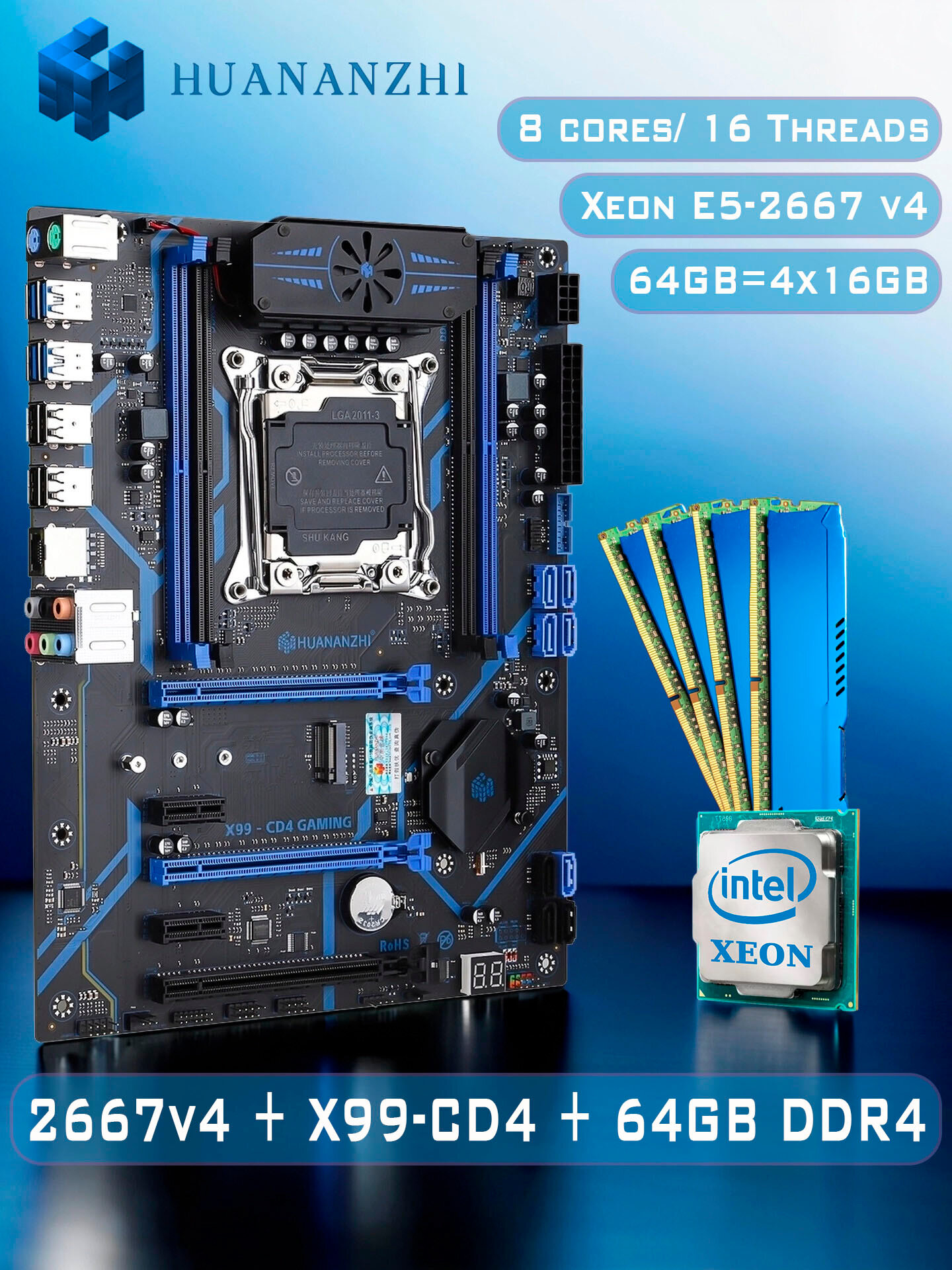 Купить Комплект материнская плата Huananzhi X99-CD4 + Xeon 2667 V4 + 64GB DDR4 ECC 4x16GB Blue с доставкой по всей России.