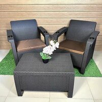 Удобные кресла с крепкими подлокотниками и мягким сиденьем идеальны для вечернего релакса после длинного трудового дня. На стильном компактном столике можно без проблем разместить посуду для семейного чаепития или легкого завтрака на двоих. Мебель выполнена из прочного полипропилена, невосприимчивого к переменчивым погодным условиям и высоким температурам.