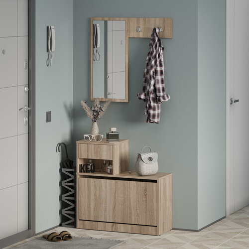 Набор состоит из настенной вешалки с большим зеркалом и напольной тумбы с выдвижным ящиком, полочкой и откидывающейся обувницей. Вешалка оборудована двумя двухрожковыми крючками для вещей и аксессуаров. Каждый рассчитан на нагрузку до 5 кг. Вертикально вытянутое зеркало отражает свет, делая прихожую просторнее и светлее, а также помогает проверить внешний вид перед выходом из дома. Асимметричный напольный шкафчик дополняет вешалку. Выдвижной ящик оборудован долговечными роликовыми направляющими и пригодится для хранения мелочей. Нагружать его следует не более, чем на 3 кг. Суммарная нагрузка на столешницу составляет до 14 кг. Можно поставить предметы декора, ящики, сумки. Обувница представлена в виде удобной и компактной системы хранения обуви на надежных кронштейнах. Она позволяет хранить обувь вертикально, экономя пространство и поддерживая порядок в прихожей. Тумбу рекомендуется закрепить к стене креплением, которое идет в комплекте.