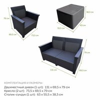 Конструкция мебели выполнена из прочного искусственного ротанга, который является отличной альтернативой традиционной садовой мебели. Искусственный ротанг не только выглядит элегантно, но и устойчив к воздействию погодных условий, что гарантирует долгий срок службы изделия. Благодаря этому комплект садовой мебели прослужит вам многие сезоны, сохраняя свой первоначальный вид.