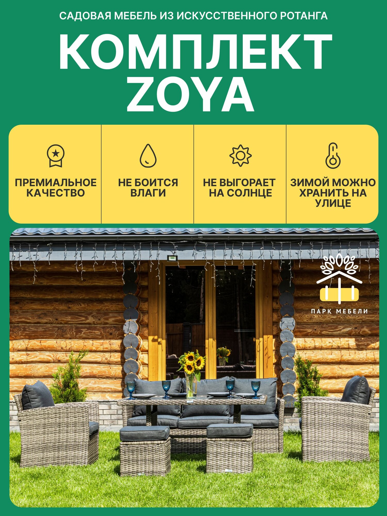 Комплект ротанговой мебели Zoya из полукруглой нити серого цвета предназначен для обустройства площадок у бассейна, беседок, террас, балконов, веранд. Его можно купить для частного дома или дачи, а также установить в летних ресторанах и кафе.