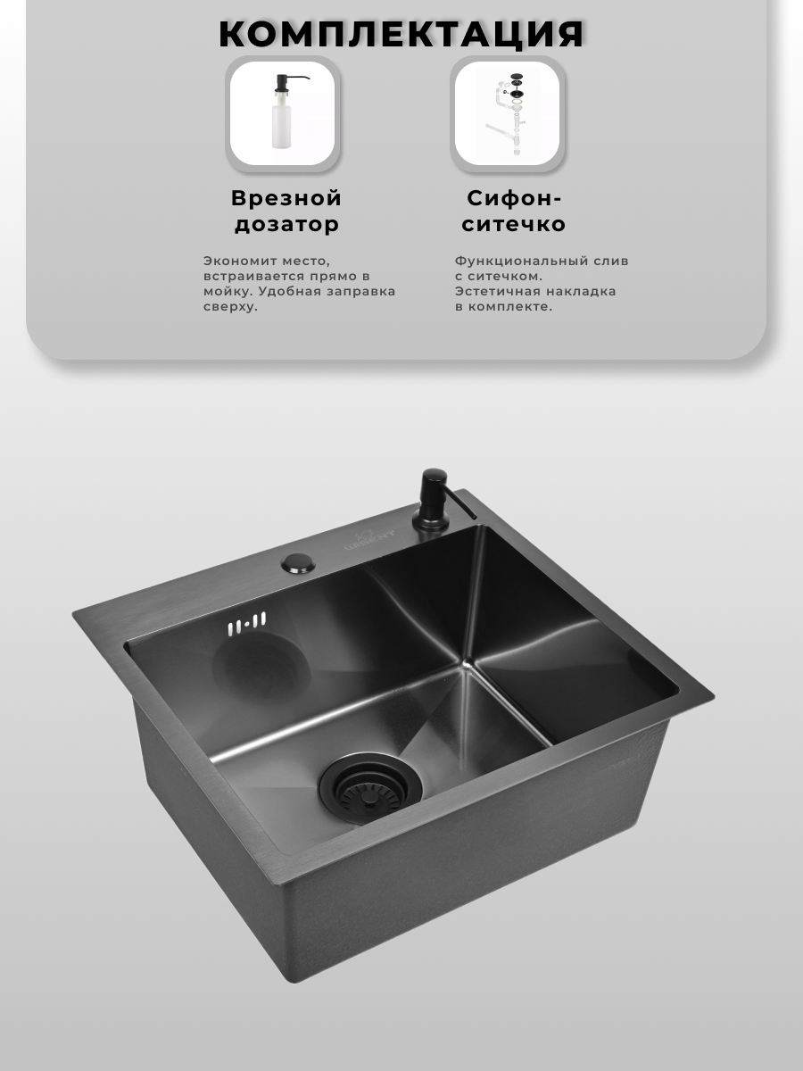 Купить Мойка для кухни нержавеющая 58х48, с PVD покрытием графит. Сифон с ситечком, дозатор. с доставкой по всей России. Мойка для кухни нержавеющая 58х48, с PVD покрытием графит. Сифон с ситечком, дозатор.: сравнение цен, характеристики, фото, актуальное наличие и цены.