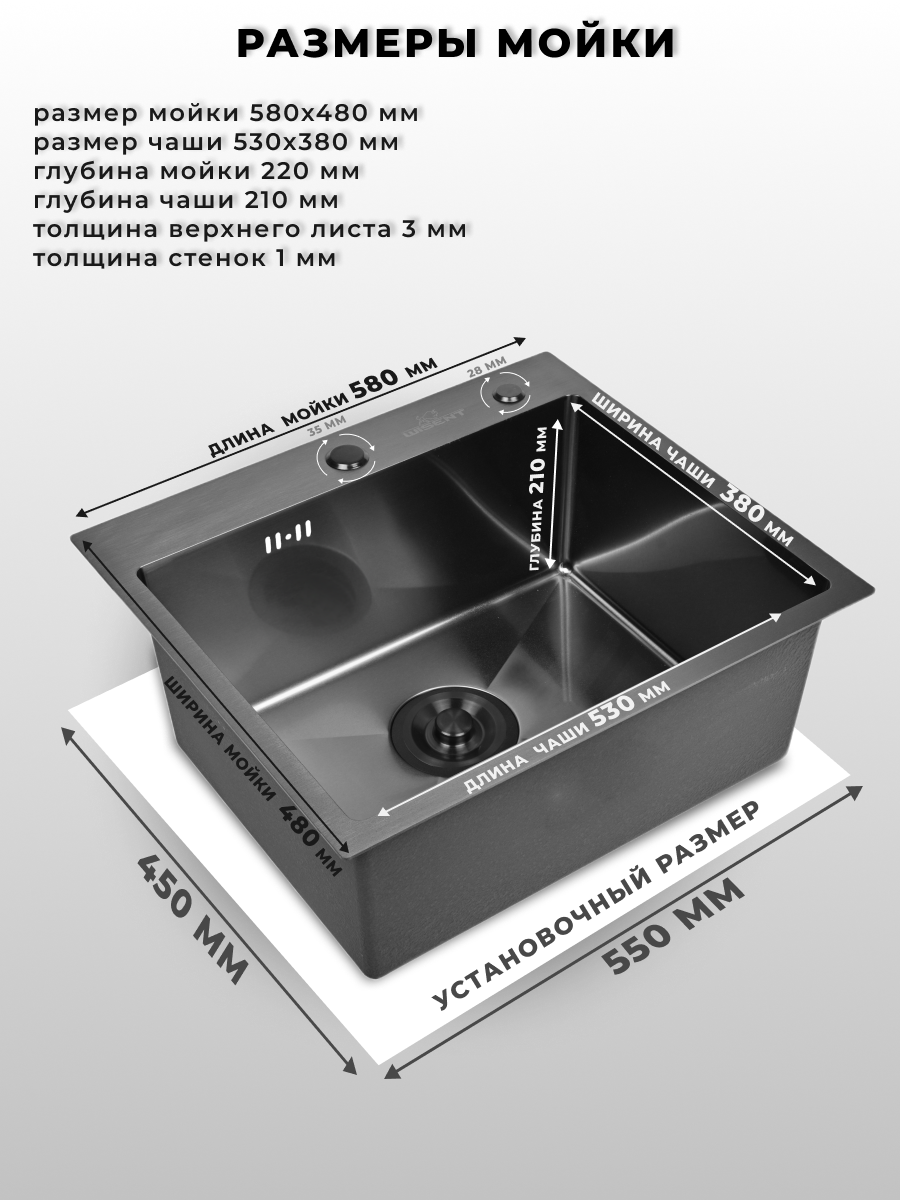 Размер мойки: ширина 58 см, глубина 48 см, высота 22 см. Размер чаши: ширина 53 см, глубина 38 см, высота 20 см. Минимальный размер отверстия в столешнице для врезной установки: ширина 55 см, глубина 46 см.