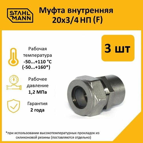 Комплект муфт соединительных Stahlmann, внутренняя резьба (F), никелированное покрытие, 20х3/4 НП EF, цвет серый, 3 шт.: сравнение цен, характеристики, фото, актуальное наличие и цены.