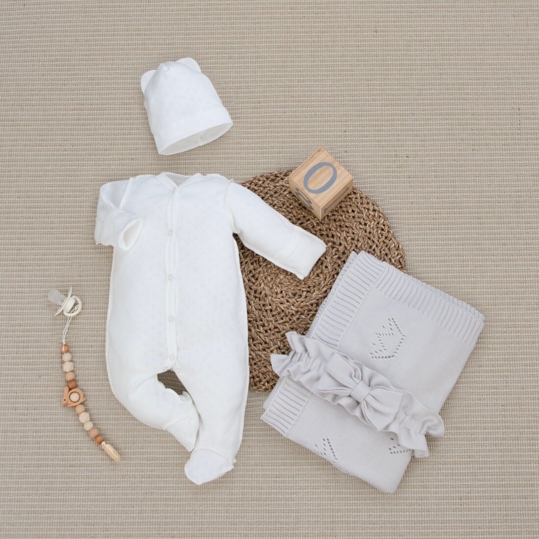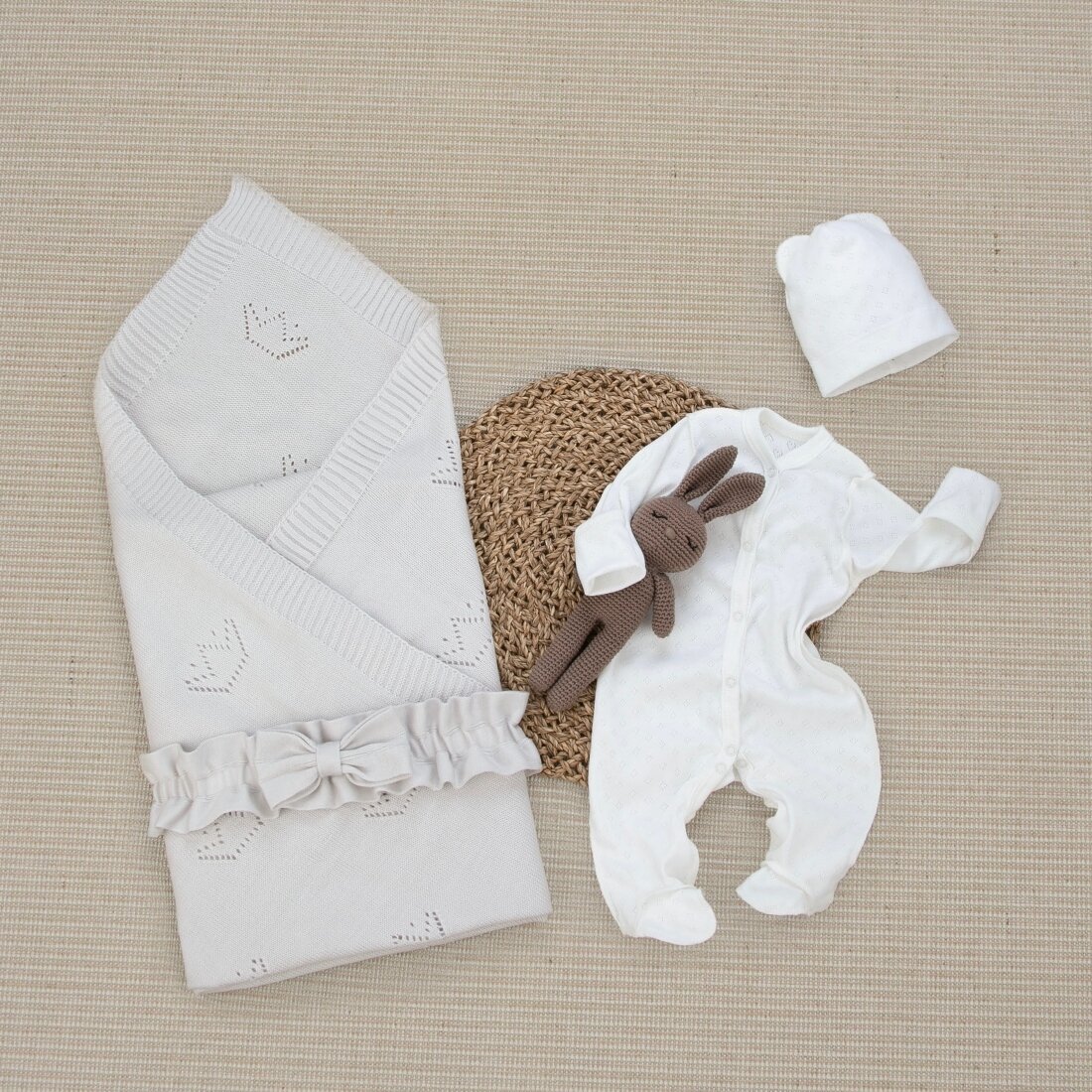 1. Плед вязаный двухсторонний 90х90 см 2. Бант на резинке 3. Комбинезон-слип 4. Шапочка легкая на манжете