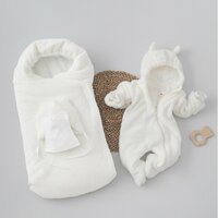 1. Одеяло-конверт 86*67 из велсофта 2. Шапочка легкая с ушками 3. Комбинезон-слип 4. Комбинезон утепленный 5. Шапочка утепленная
