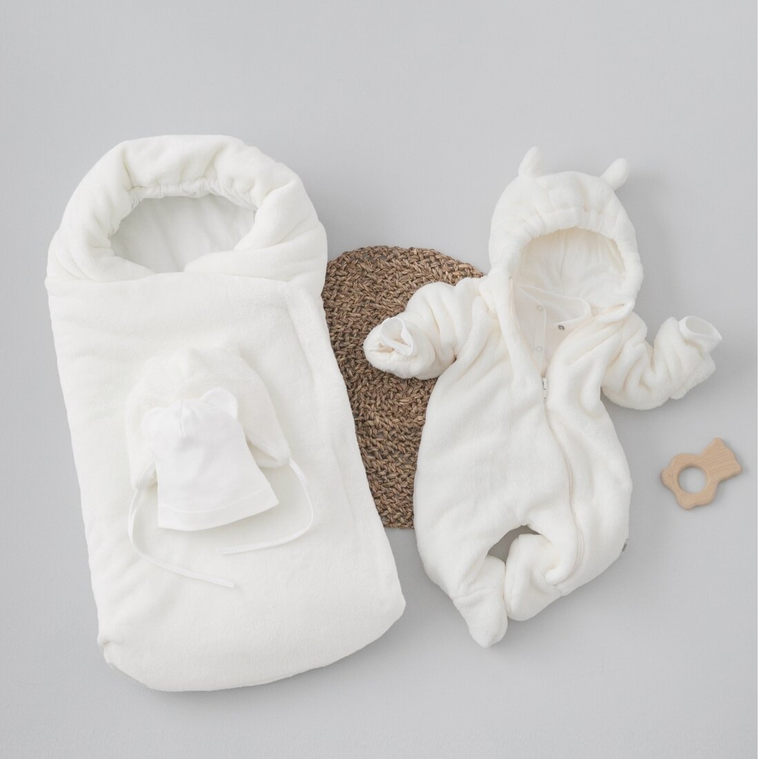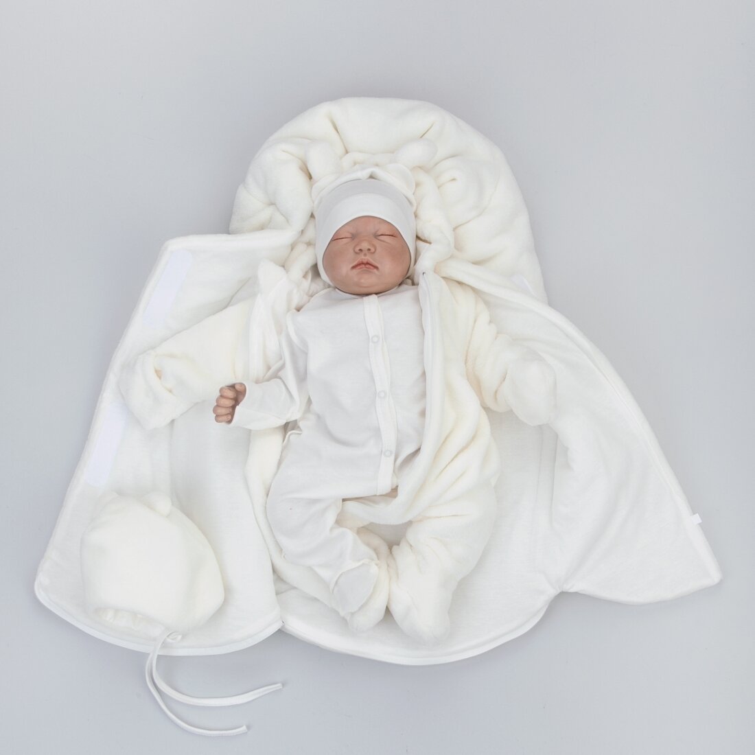 Состав одеяла-конверта: верх - велсофт (п/э 100%), наполнитель синтепон 200 г/м2, подклад - трикотаж кулир высшего качества (хлопок 100%) Состав утепленного комбинезона и шапки: верх - велсофт (п/э 100%), подклад - трикотаж кулир высшего качества (хлопок 100%) Состав одежды: трикотаж интерлок высшего качества (хлопок 100%)