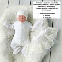 Комплект из 5 позиций: -вязанный плед с хлопковым подкладом (кулирка), размер 90х100, пряжа 50% шерсть+50% акрил - вязаный бант на резинке - комбинезон на кнопках, размер 56, хлопок 100% (интерлок), украшен декором, швы наружу, антицарапки - юбочка на широком мягком поясе, кружево+фатин - колпачок, украшен декором, размер 38