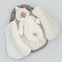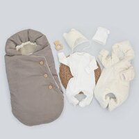 Состав конверта: Ткань верха - мембранная ткань LOKKER TOPS (полиэстер 100%), наполнитель – синтепон 200 г/м2, подклад – овечья шерсть в сочетании с искусственным мехом (70% мех 30% п/э) Состав утепленного комбинезона и шапочки: верх - плюш (полиэстер 100%), наполнитель: синтепон 100 г/м2, подклад - трикотаж кулир высшего качества (хлопок 100%) Состав комплекта одежды: трикотаж интерлок высшего качества - хлопок 100%