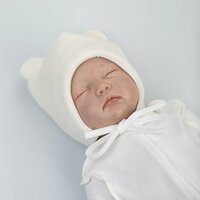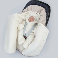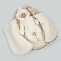 Состав конверта: Ткань верха - мембранная ткань LOKKER TOPS (полиэстер 100%), наполнитель – синтепон 200 г/м2, подклад – овечья шерсть в сочетании с искусственным мехом (70% мех 30% п/э) Состав утепленного комбинезона и шапочки: верх - плюш (полиэстер 100%), наполнитель: синтепон 100 г/м2, подклад - трикотаж кулир высшего качества (хлопок 100%) Состав комплекта одежды: трикотаж интерлок высшего качества - хлопок 100%
