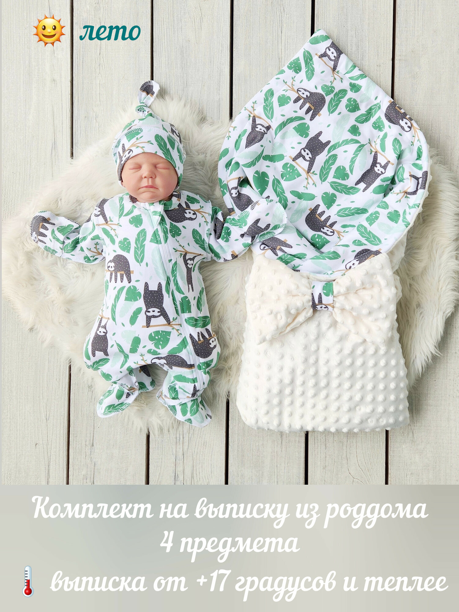 Купить Комплект на выписку из роддома, 4 позиции, лето, размер 56-62, молочный /ленивцы с доставкой по всей России.