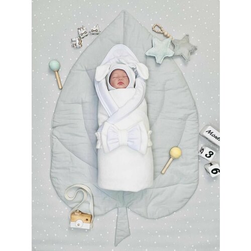 Комплект на выписку включает в себя одеяло на тонком утеплителе размером 80x80 см, которое состоит из хлопкового плюшевого велюра (80%) с одной стороны и гладкого трикотажного хлопка (100%) с другой.