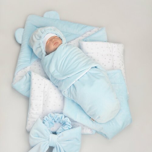 1. Одеяло 90*90 см из плюша 2. Бант на резинке из плюша 3. Шапочка легкая с ушками 4. Комбинезон-слип 5. Пеленка трансформер