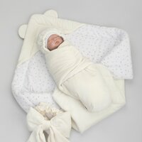 1. Одеяло 90*90 см из плюша 2. Бант на резинке из плюша 3. Шапочка легкая с ушками 4. Комбинезон-слип 5. Пеленка трансформер