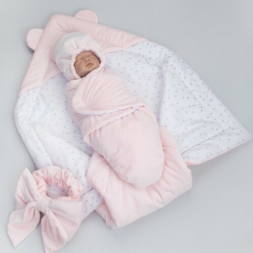 1. Одеяло 90*90 см из плюша 2. Бант на резинке из плюша 3. Шапочка легкая с ушками 4. Комбинезон-слип 5. Пеленка трансформер