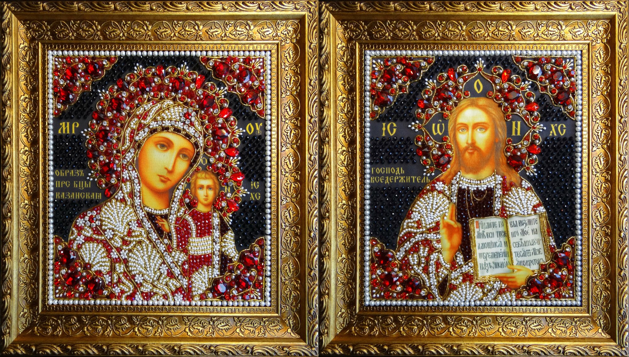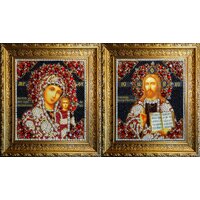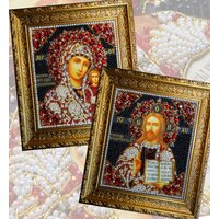 Набор для вышивания состоит из двух наборов: Богородица "Казанская" и Господь Вседержитель. Наборы состоят из тщательно отобранных материалов: хрустальные бусины, хрустальные стразы, хрустальные стразы в металлических цапах, акриловые бусины, трунцал (канитель), бисер, атласная ткань с нанесенной авторской схемой, подробная цветная инструкция с пошаговыми фото и описаниями, игла для вышивания. Размер каждой готовой работы одинаковый: 17,8 х 21 см.