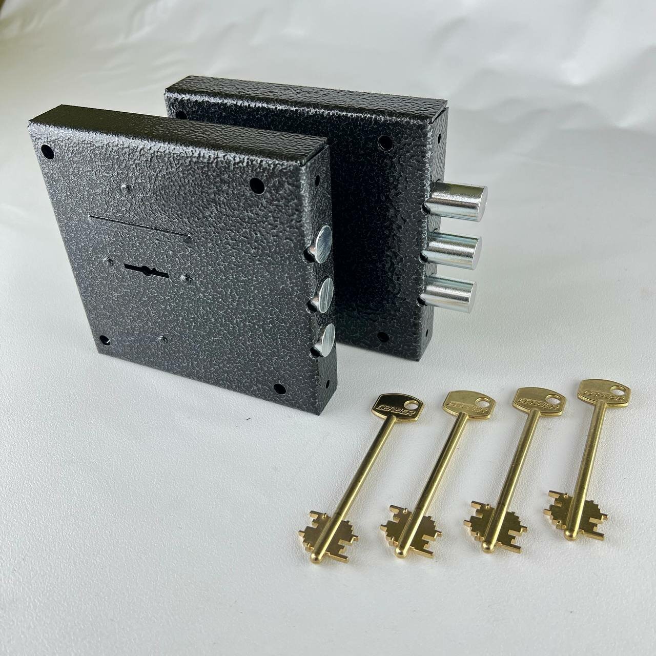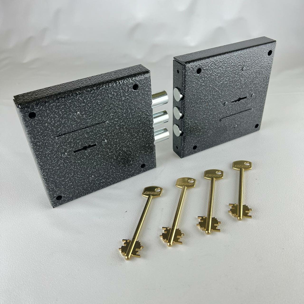 Комплект накладных замков под один ключ CERBER C1-М ЗНУ-М 126 (2 замка; 4 ключа по *60 мм - длина стержня ключа, полная длина ключа - 100 мм; 2 ответные планки; 2 запорные пластины; 2 накладки). Артикул: С1-М-126-2.