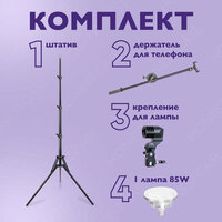 Сборка и настройка напольного комплекта очень быстрая и простая, что делает его удобным и доступным для использования как опытными профессионалами, так и начинающими. В комплекте идут все необходимые компоненты: держатель для телефона типа журавль, стабильный штатив, 1 лампа мощностью 85 Вт, пульт управления, патрон, провод питания.