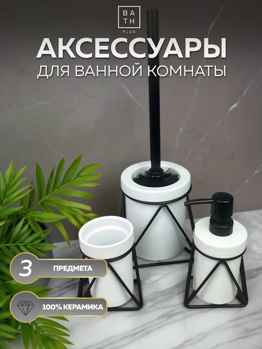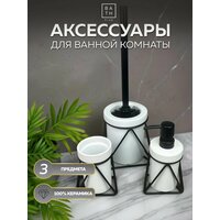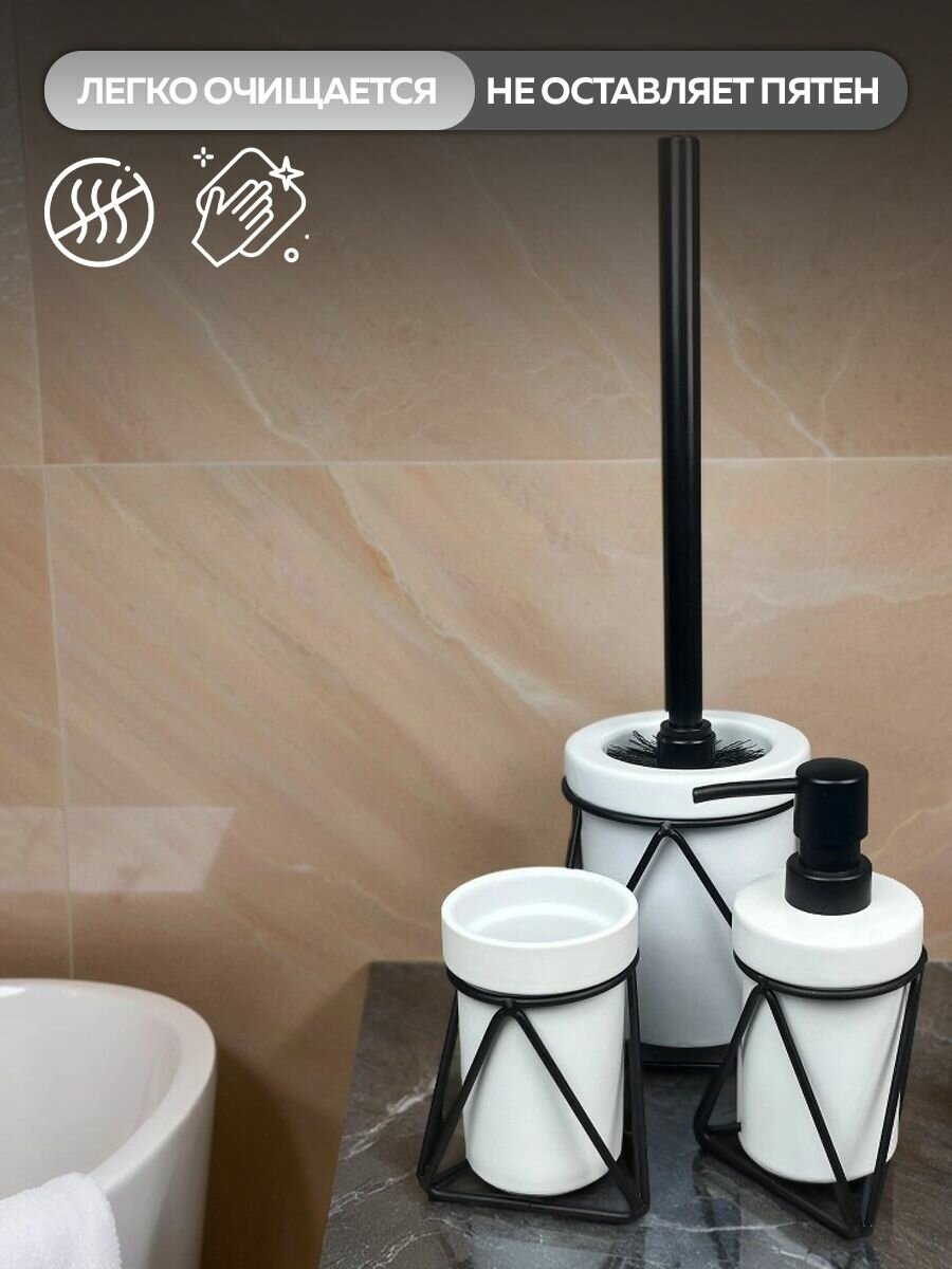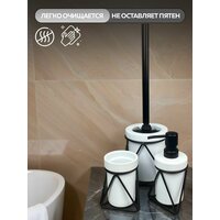 Керамический набор для ванной комнаты и туалета -незаменимый аксессуар для дома. Настольный набор состоит из ерша с подставкой, мыльницы, дозатора и стаканчика для зубных щёток.