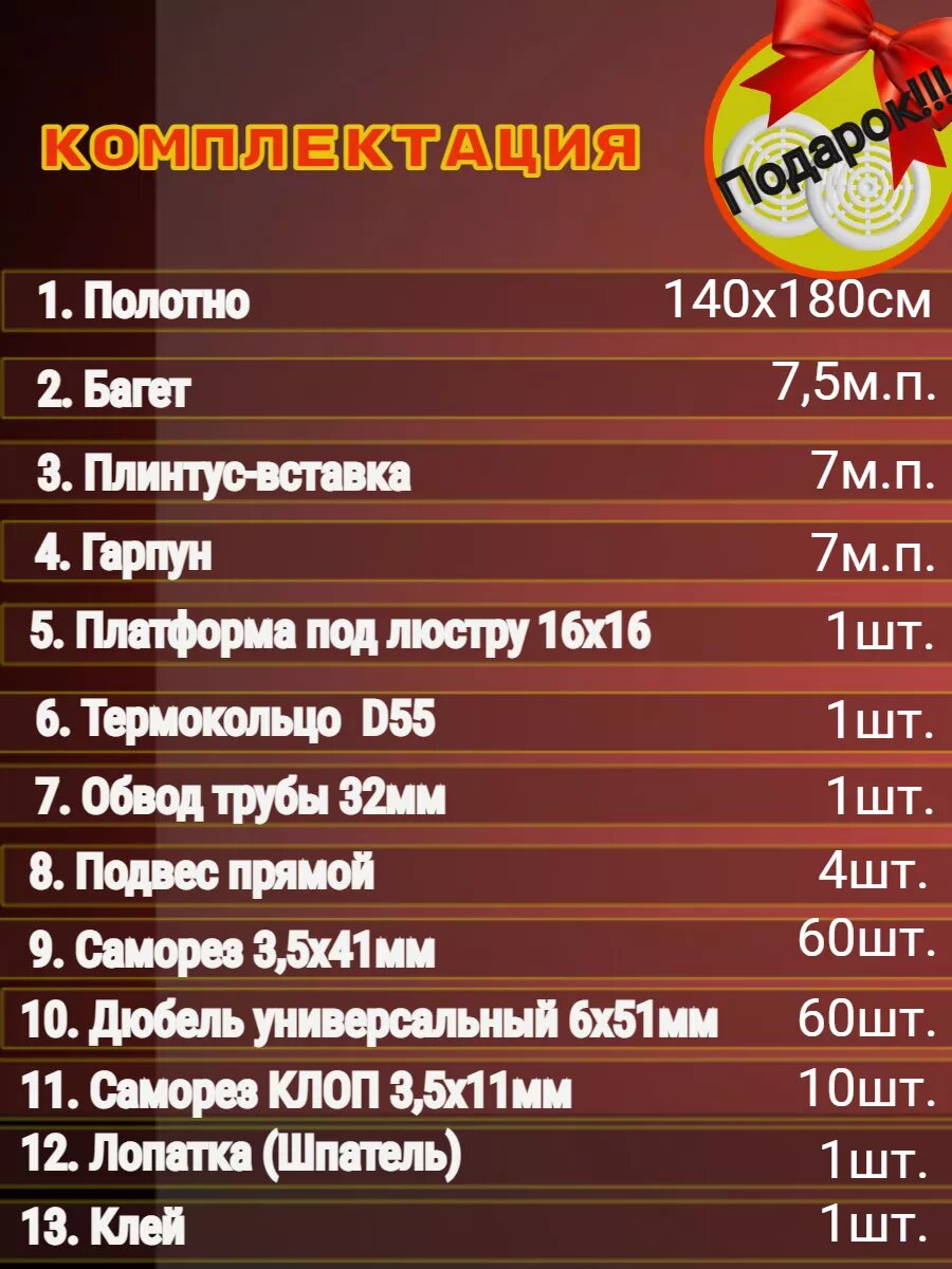 | Подробная комплектация | Полотно натяжного потолка, багет, гарпун, плинтус-вставка, платформа под люстру 16х16 см, подвесы для крепления люстры, термокольцо диаметром 55мм, пластиковый обвод трубы 32мм, суперклей, лопатка - шпатель для монтажа потолка деревянная, вентрешетки диаметр 50мм, крепеж (дюбель универсальный 6*51, саморез 3,5*41, саморез КЛОП 3,5*11) |