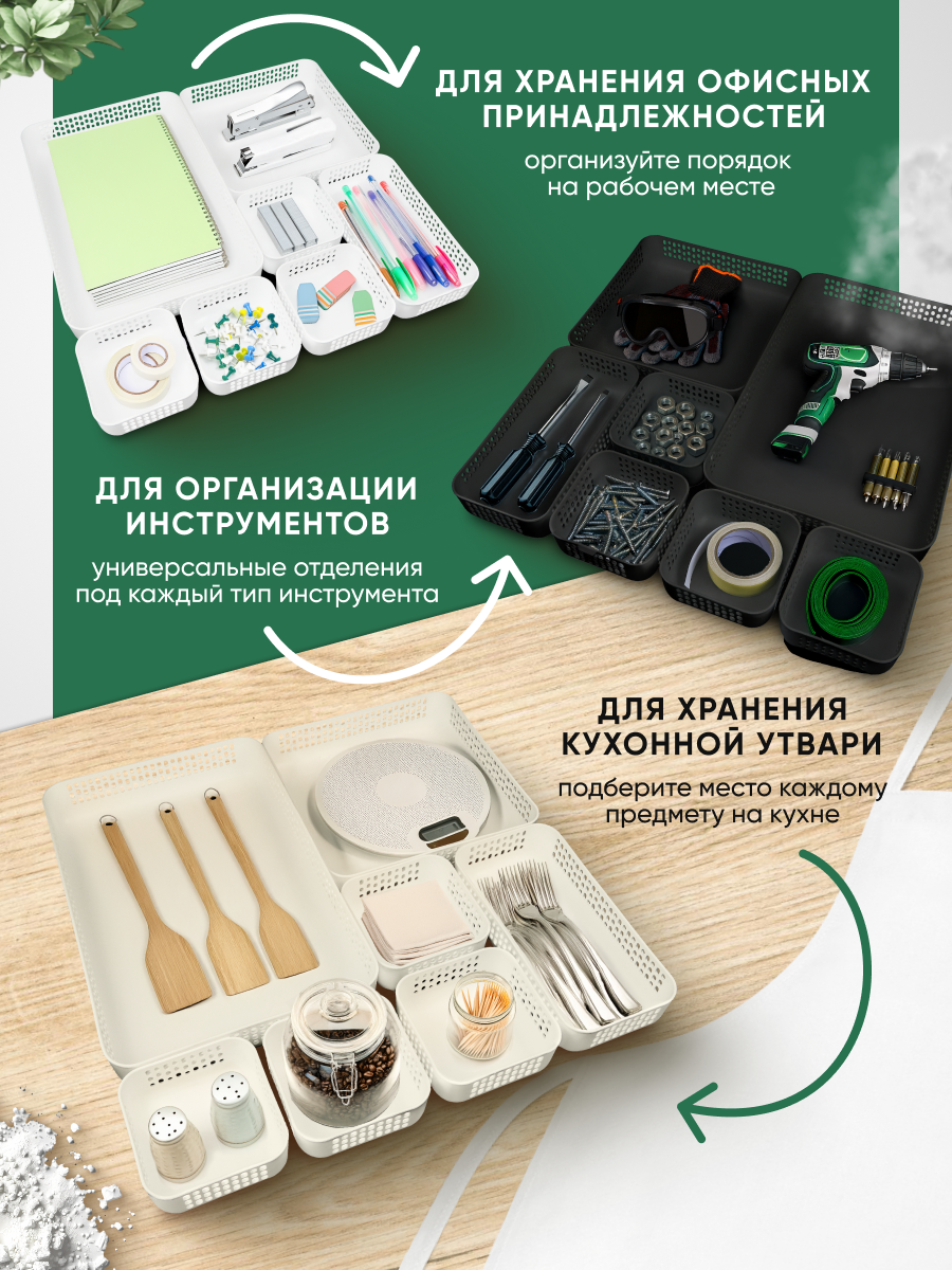 Откройте мир удобства и функциональности с набором складываемых друг в друга открытых органайзеров UNO. Они идеально подходят для хранения вещей в тумбочках и шкафах, обеспечивают порядок и эстетичный вид вашего интерьера. Линейка UNO включает в себя 5 органайзеров разных размеров, что позволяет подобрать оптимальный вариант компоновки в соответствии с габаритами организуемой площади. Органайзеры можно использовать для косметики, для канцелярии, для проводов, для украшений. Настольный органайзер для хранения вещей можно поставить в ванной и использовать для хранения мелочей.